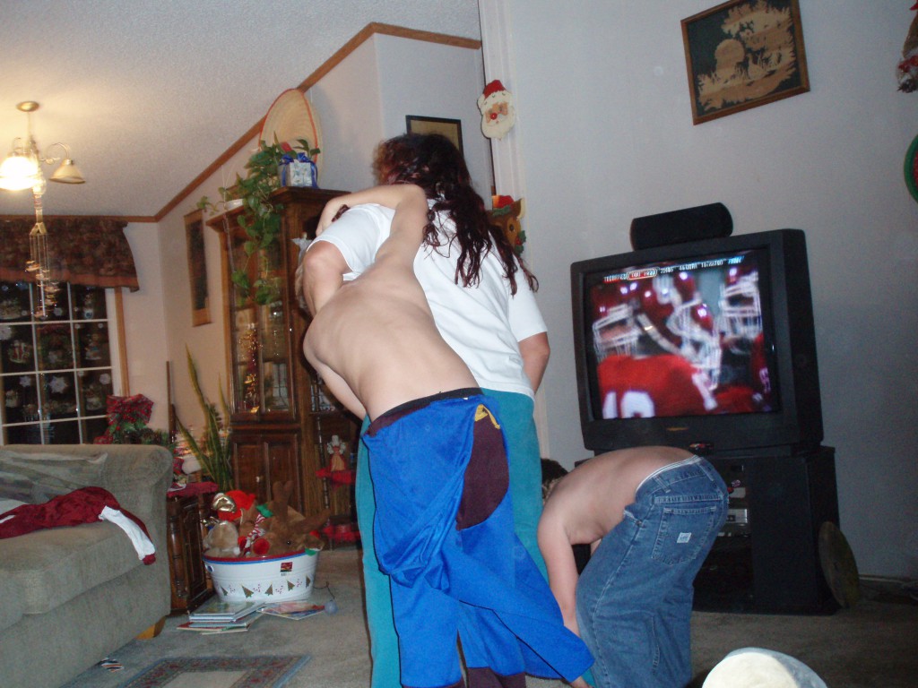 I wanted to tell you that I lost 25 pounds in the first 3 months but that was probably due to the fact I was anemic and nauseous, I couldn't keep anything down. They do say you will lose during treatment and no dieting. I am not even allowed to take any vitamins. Anyway now that I have a new medical team, the nausea is gone and I have gained back 3 pounds in 3 weeks. Sending photos so you can see how super duper chunky I was to begin with.....hahahaha also you can see at one time I did have enuf energy to wrestle my nephew and grandson at the same time. ha ha ha Also the 2 guys in the pic are my baby brothers. One is giving me bunny ears.......