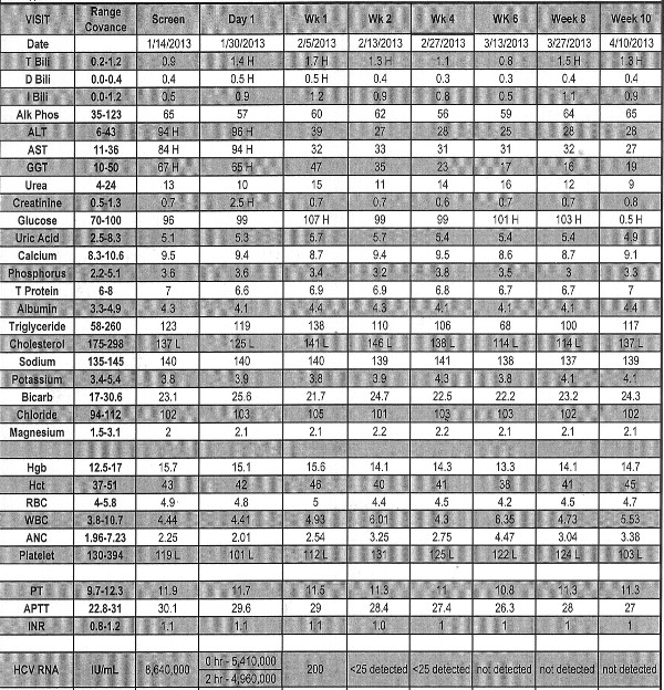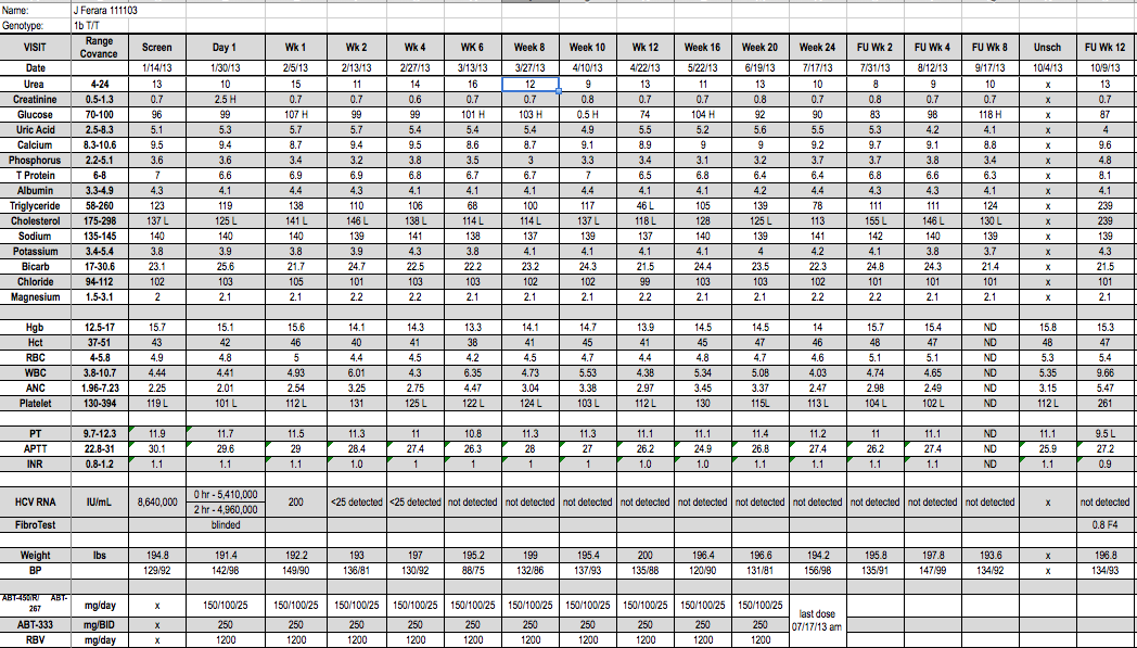 Congrats on your 12 weeks results, yours numbers look real good. They actually look good from the beginning through the end showing how little Abbvies quad treatment causes side effects on the labs. After reading your labs I got jealous and wished I had your numbers While I was on the same drugs, of course I was on the 12 week arm and who knows what would had been my outcome if I went 24 weeks.