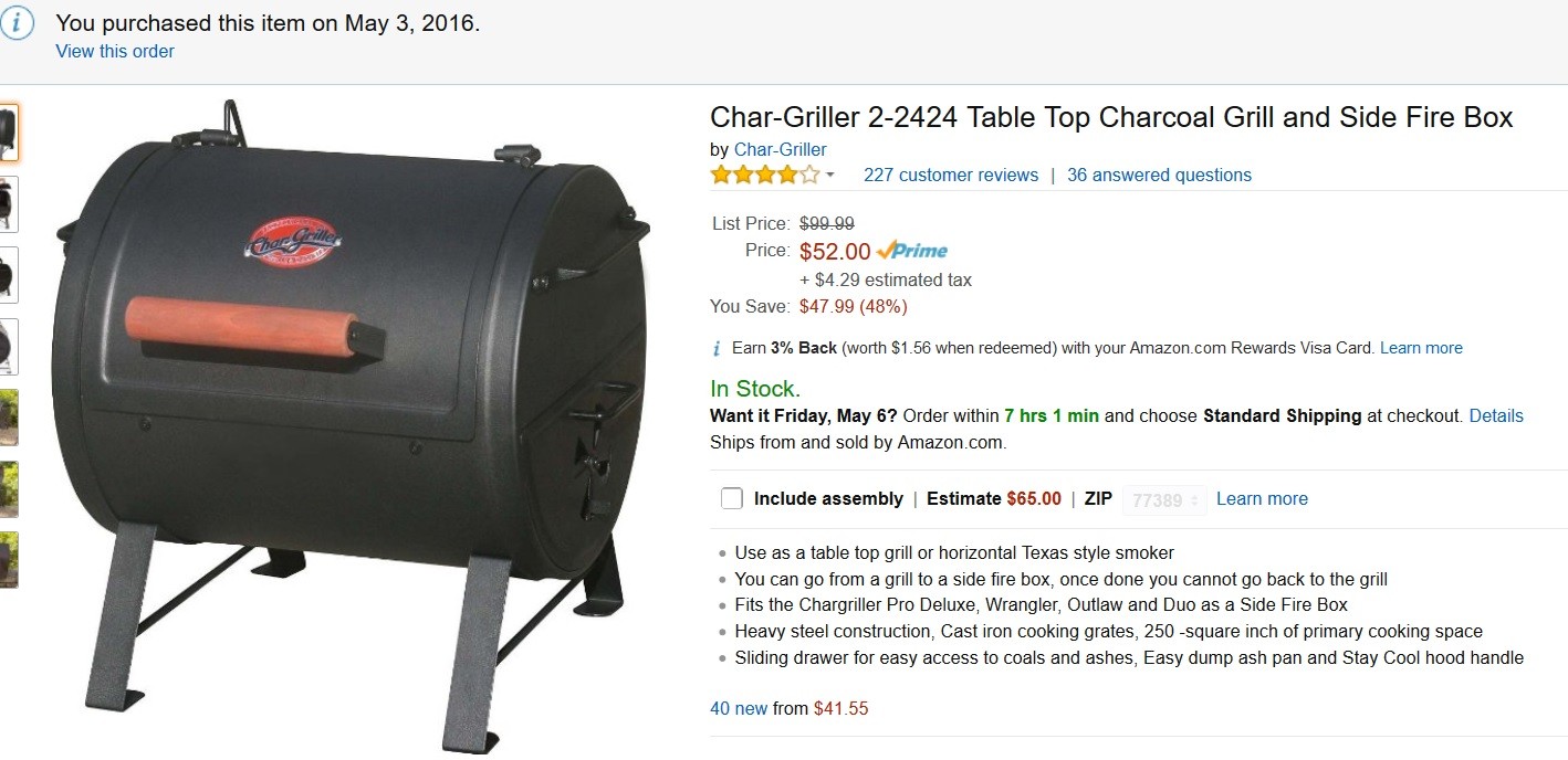 3) I am hopeless. When Carol seemed cool with the purchase I found my self looking at Char-Griller dot com. Did not take long to find a "needed LOL" modification so then it was off to do some comparative shopping and landed on #4....