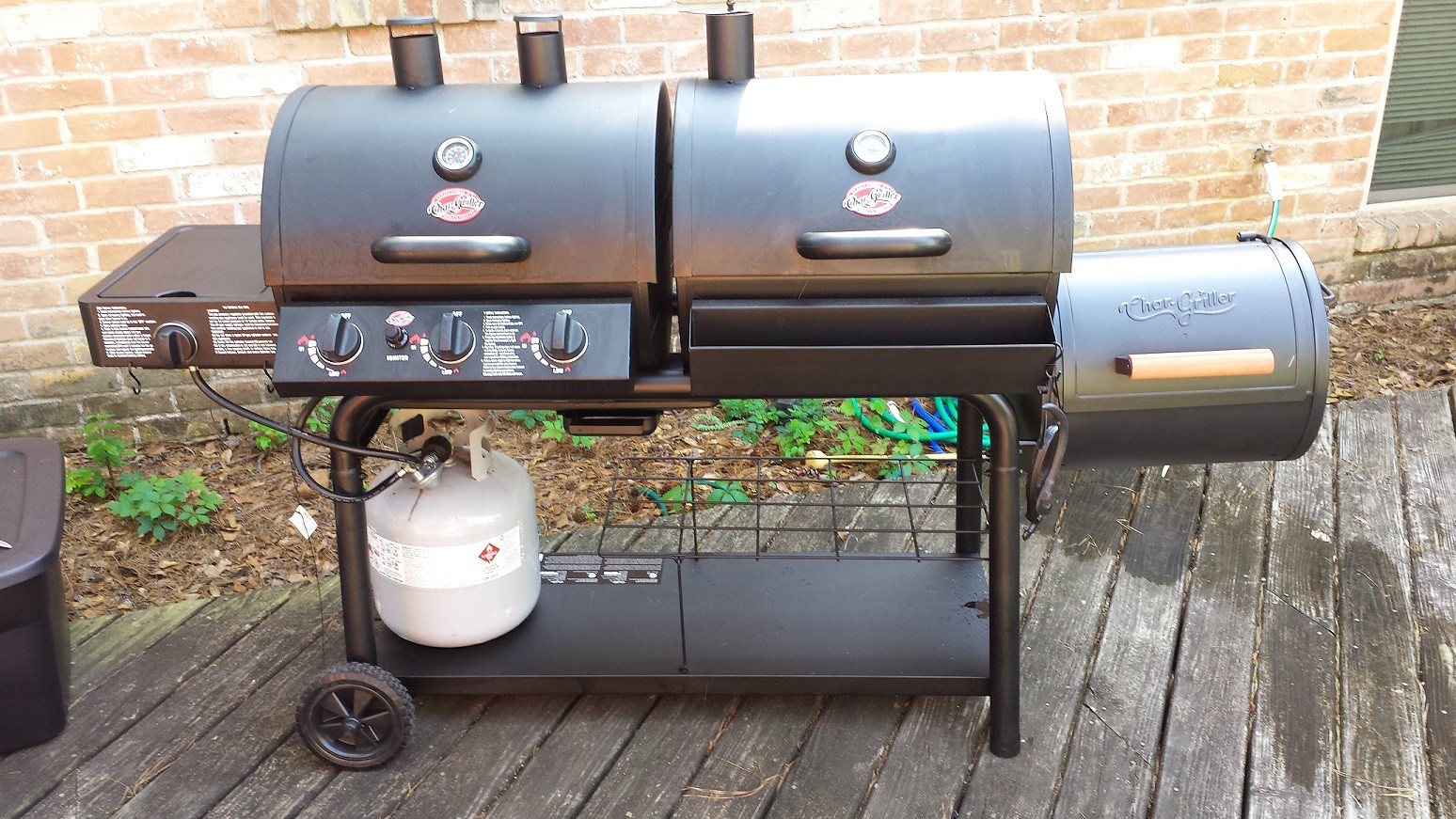 Who can resist the temptation of a new barbecue, especially when you can smoke meat on one side and do some quick grilling on the other side? Patio's looking a bit chogged up though.