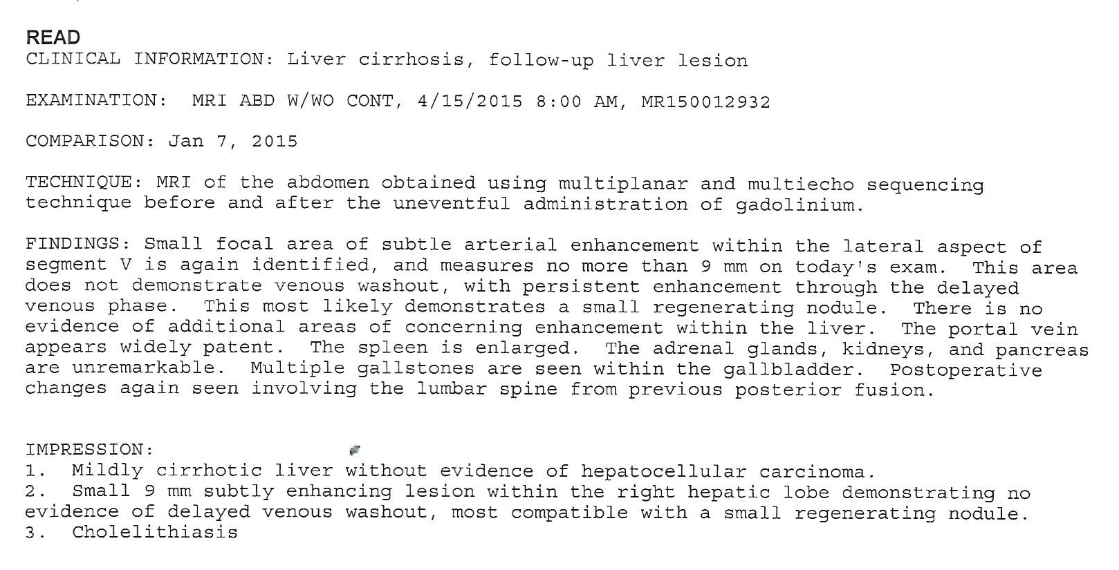 Malcolm, I sent you a link to access the complete MRI file. I know that will be more useful for you than me posting random images. My past MRI final reports usually mentioned small amounts of ascites fluid but the one done 10-14-2015 list "Trace Free Fluid Present" but it doesn't give a location. The newest report done 2-10-16 does not mention any fluid. What I do find odd is that the new report says my 9mm lesion is "not definitely identified". Does this mean the lesion is smaller than on previous MRI's or that the radiologist just didn't get a sufficient image of it on this MRI?