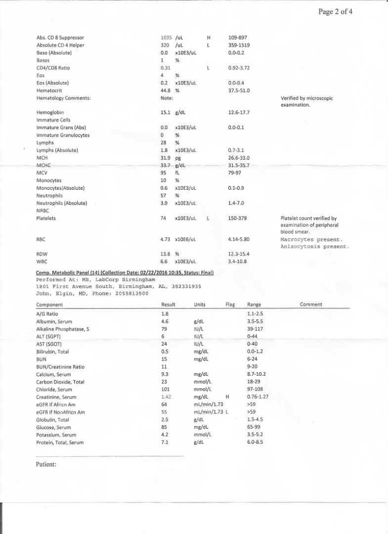These are my latest lab results done by my HIV doctor on 2-22-16. Everything looks pretty good, especially: Absolute CD 4 Helper - 320 Platelets - 74 (up from 64 on 12-3-15) ALT - 6 AST - 24 (a good indication that my HCV viral load continues to be UND)