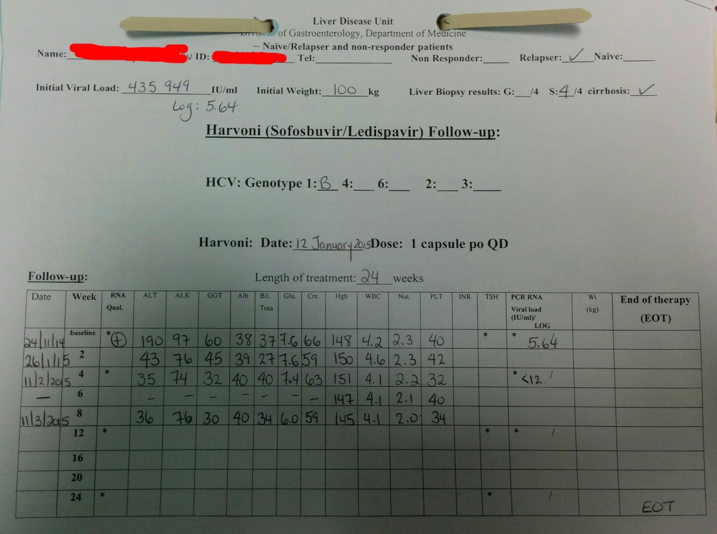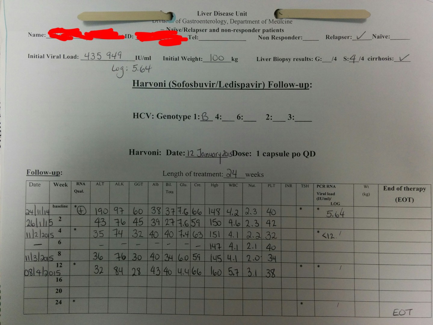 2nd Tx: Harvoni for 24 wks, started 12/Jan/2015