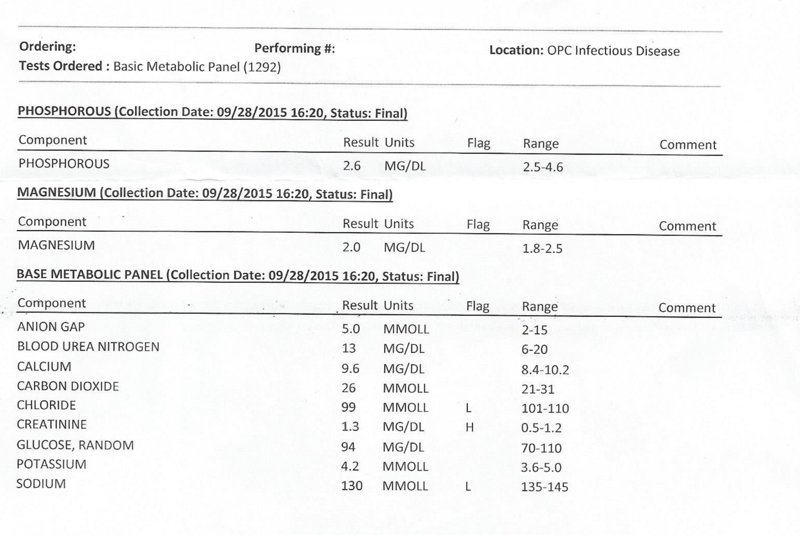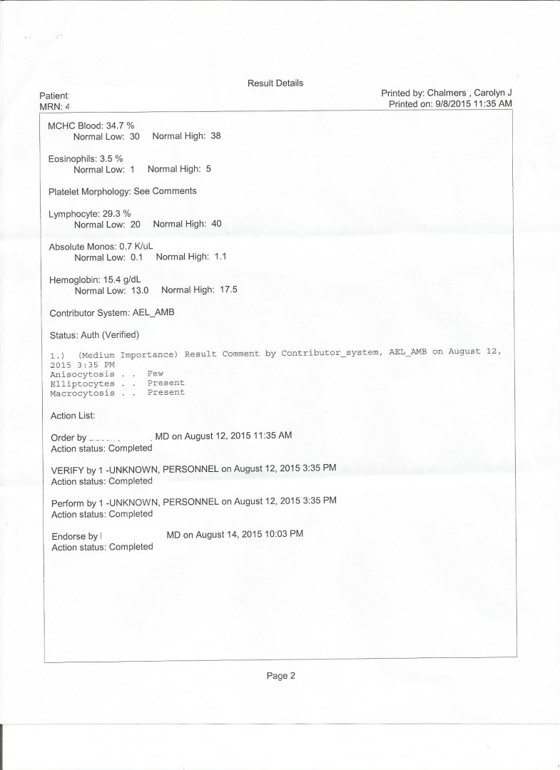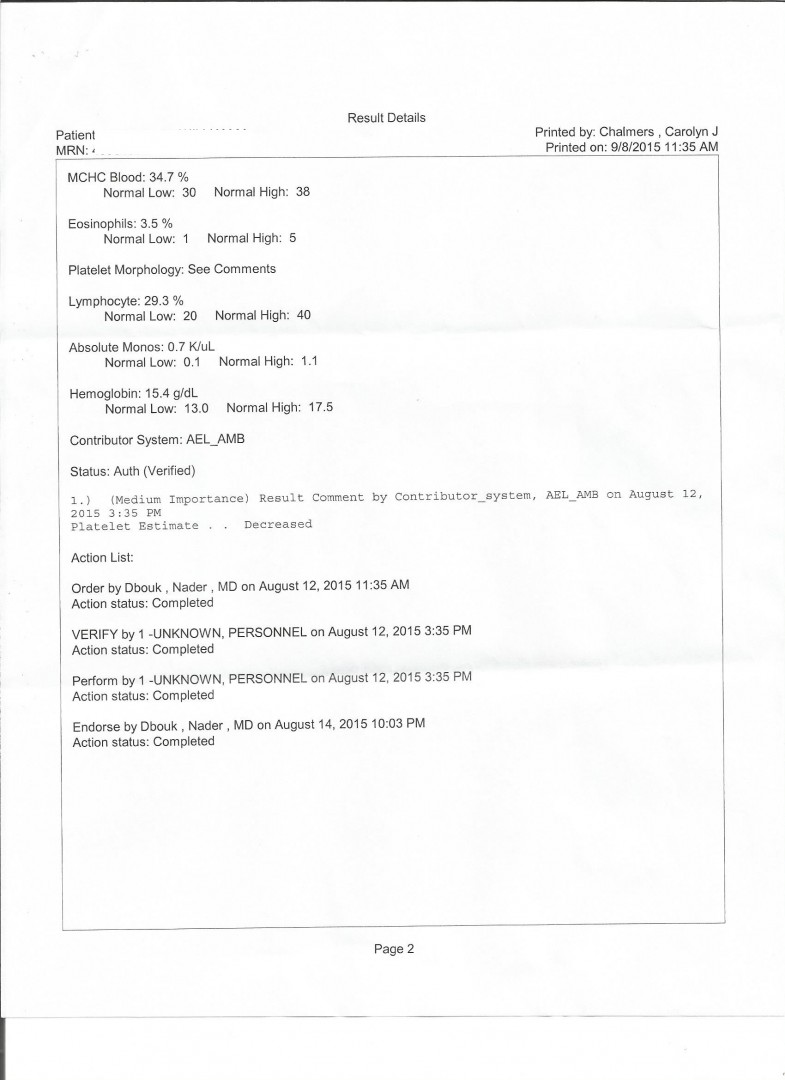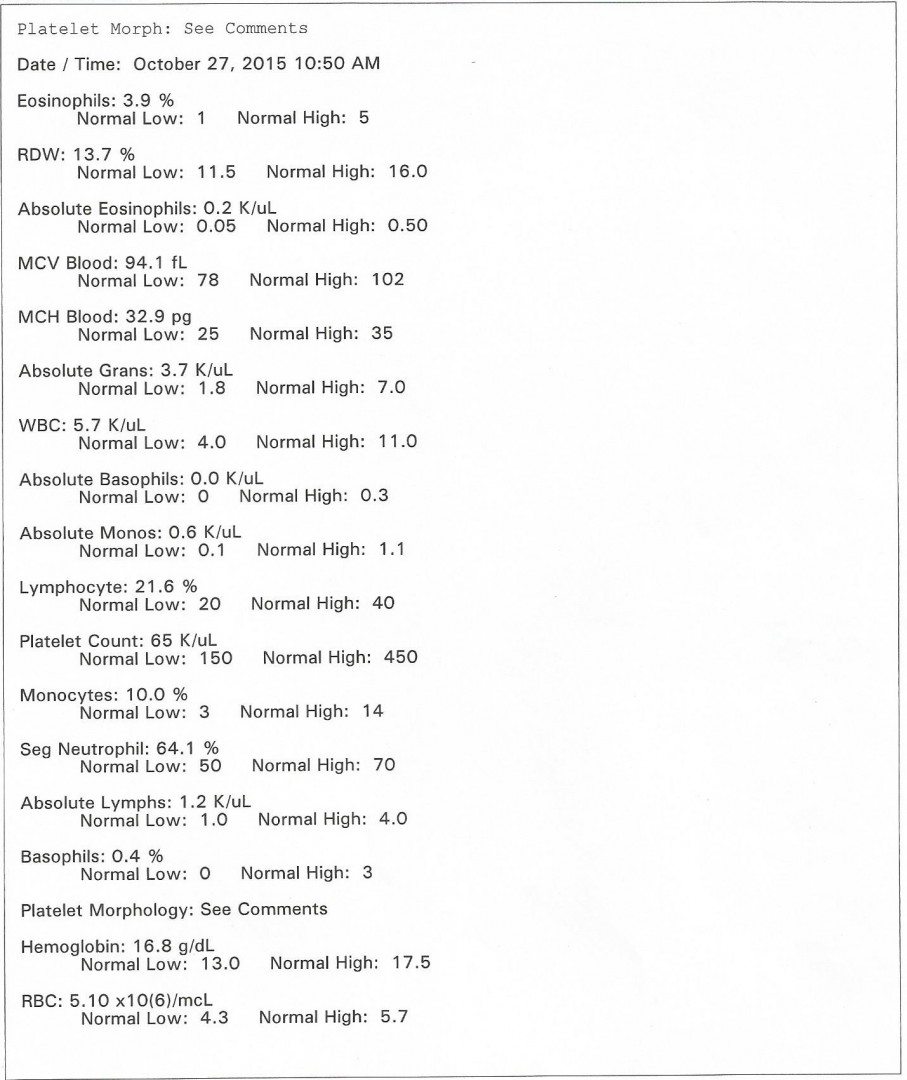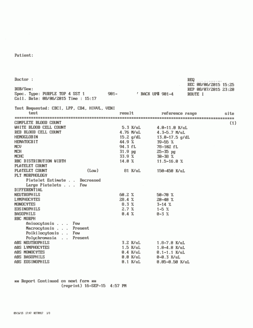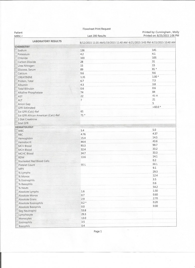 Here's my most recent lab work ordered by HIV doctor 9-28-15. It looks like I don't have an issue with Ledipasvir / Tenofovir toxicity. I'll sleep better tonight I just better not cut myself on anything with platelet count 50.