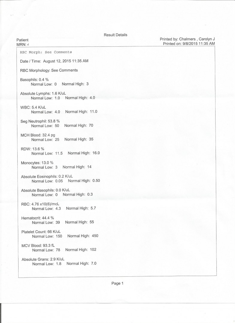 Thanks Jill. I'm a little concerned about the low (66) platelets, but that's been a constant issue since long before starting the Harvoni and it hasn't caused any problem so far that I'm aware of.