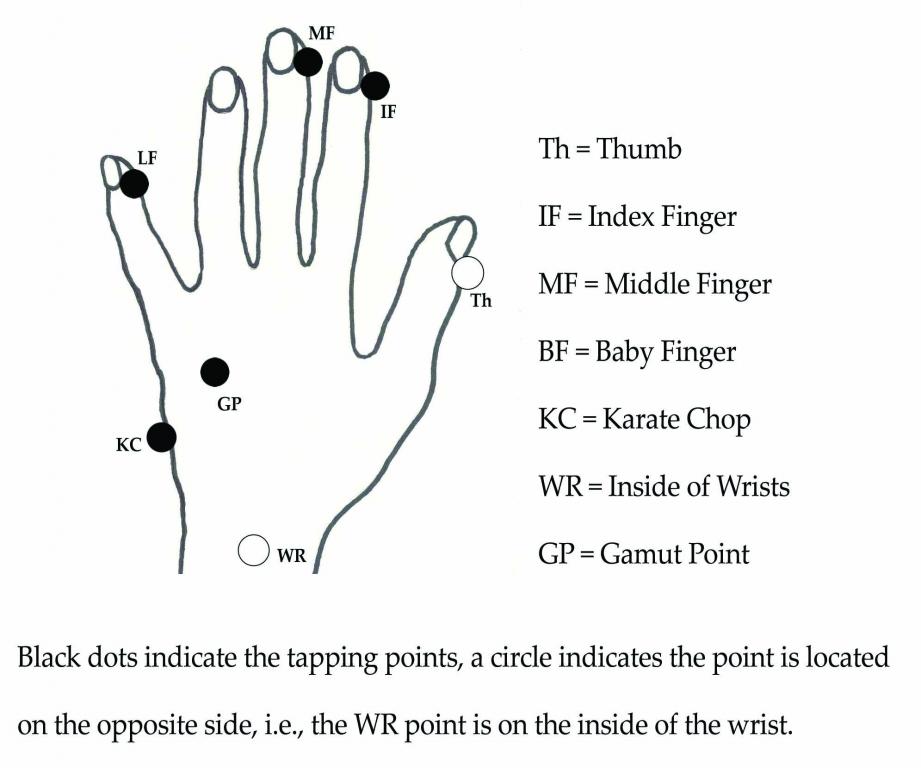 2. The Sequence = Tap about 7 times on each of the following meridian points while repeating the Reminder Phrase only (this anxiety, anger or whatever was your negative emotion) at each point. TH = top of head EB = inner edge of eyebrow SE = side of eye UE = under eye UN = under nose, above lip Ch = under mouth on upper chin area CB = collar bone UA = under arm on side BN = Below nipple Th = thumb IF = index finger MF = middle finger BF = baby finger KC = karate chop WR = inside of wrist 3. Find Gamut point on illustrationContinuously tap on the Gamut point while performing each of these 9 actions: