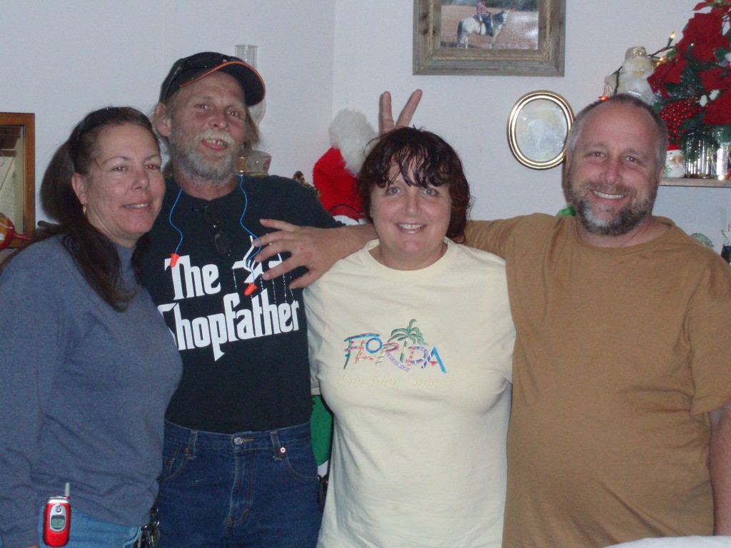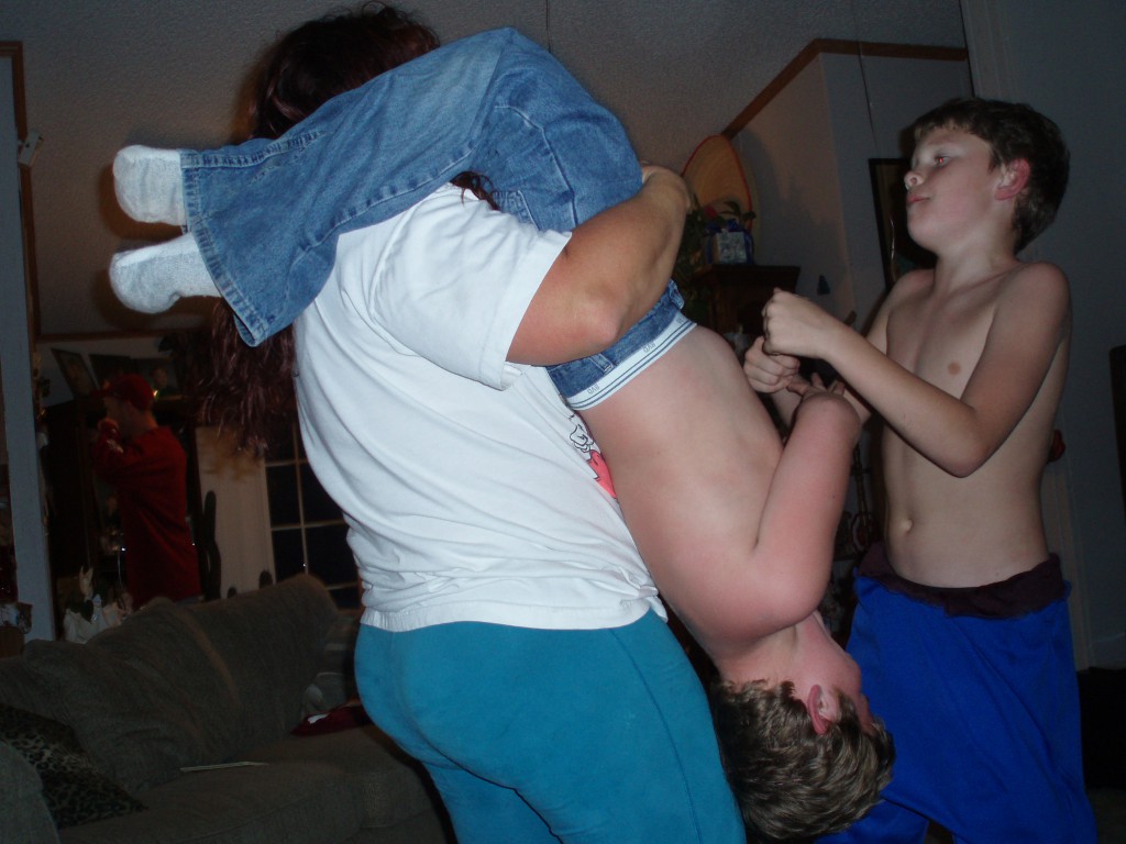 I wanted to tell you that I lost 25 pounds in the first 3 months but that was probably due to the fact I was anemic and nauseous, I couldn't keep anything down. They do say you will lose during treatment and no dieting. I am not even allowed to take any vitamins. Anyway now that I have a new medical team, the nausea is gone and I have gained back 3 pounds in 3 weeks. Sending photos so you can see how super duper chunky I was to begin with.....hahahaha also you can see at one time I did have enuf energy to wrestle my nephew and grandson at the same time. ha ha ha Also the 2 guys in the pic are my baby brothers. One is giving me bunny ears.......