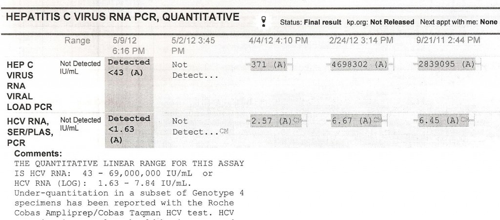 Because the HCV RNA level was below 43 IU/mL using the Real-Time PCR method, the sample was assayed using the Transcription-Mediated Amplification(TMA) method." Good luck, Judy and everyone on this journey,
