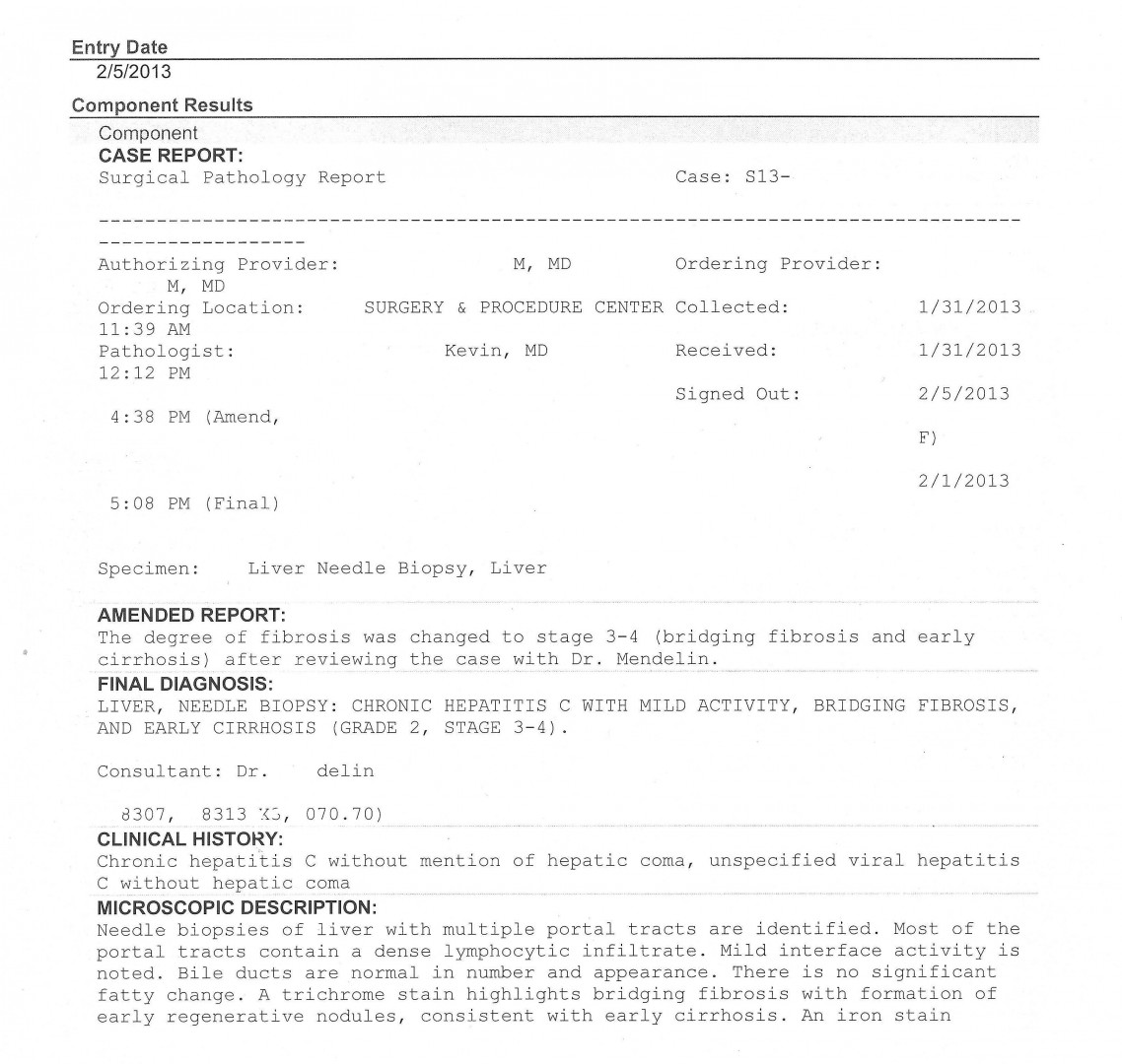 I'll just mention how I've learned to report biopsies and how they are reported here, then we can let it rest. Firstly, biopsy specimens should be over 2 cm. long, and contain at least 10 portal tracts. Smaller specimens should be interpreted with caution, erring on the most severe stage. Bridging fibrosis is found in Fibrosis Stage 3-4, between portal tracts. A few bridging septa are allowed between central veins. If regenerative nodules are present, this is F4. So, over here, reading your report, you would be classified as F4. It seems petty, but early cirrhosis seems to be a nothing diagnosis. Just my opinion. Cheers.