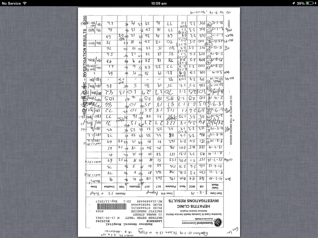 Good results, especially the AST and ALT. I'm a bit confused about the Ribavirin dose. Obviously it was reduced for a time, but are you now back to 1,200 mg/day?