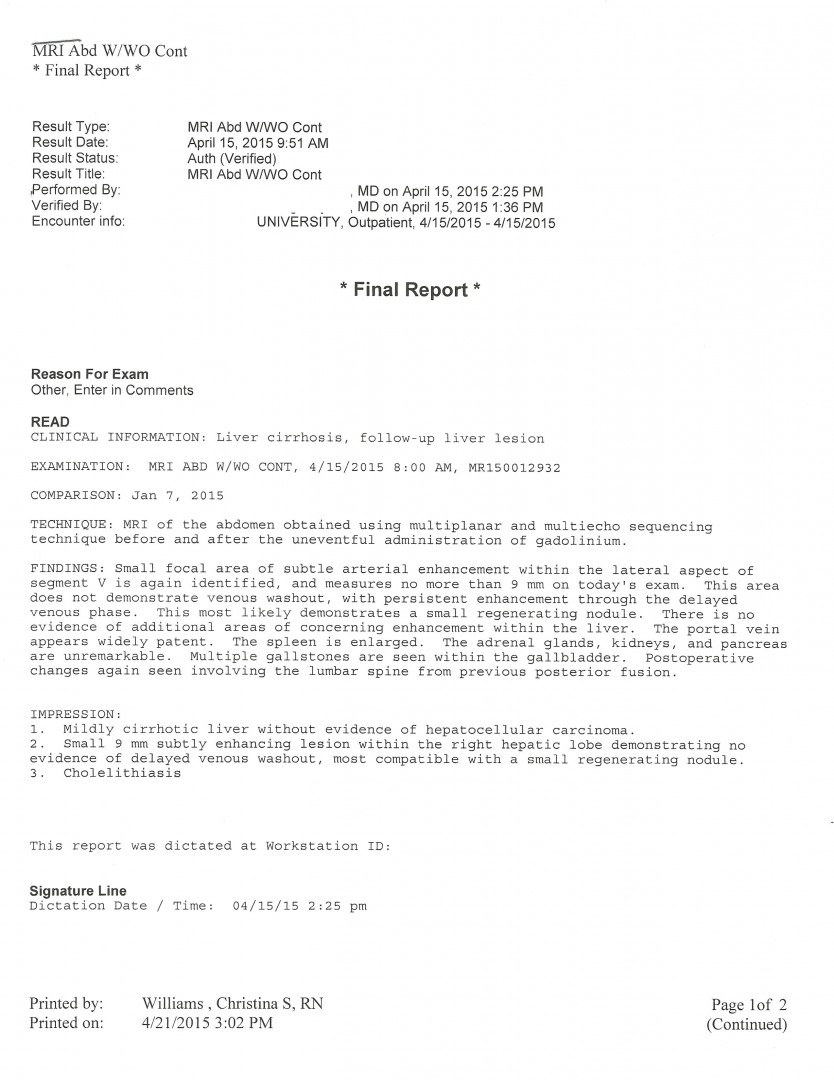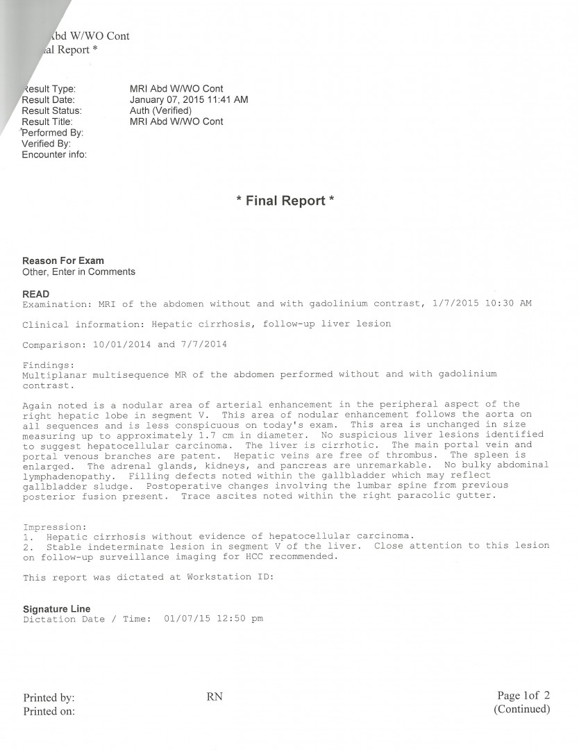 I've been having MRI'S done every 3 months for the past ~1 year looking for possible HCC. The latest MRI done 0n 4-15 mentions gallstones as opposed to all other MRI final reports that I've had which do not mention this (see attachments). I'm wondering if this find is a newly acquired issue or is it just what is noteworthy to a different person writing the report?