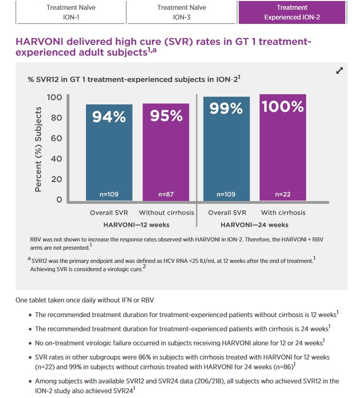 The second slide is the ION II Study table in cases like mine where treatment has failed. 12 weeks if non cirrhotic produced 95% SVR and 24 weeks produced 99% including 22 out of 22 cirrhotics at 100%. n=109 in each study so not small and specific to repeat offenders.