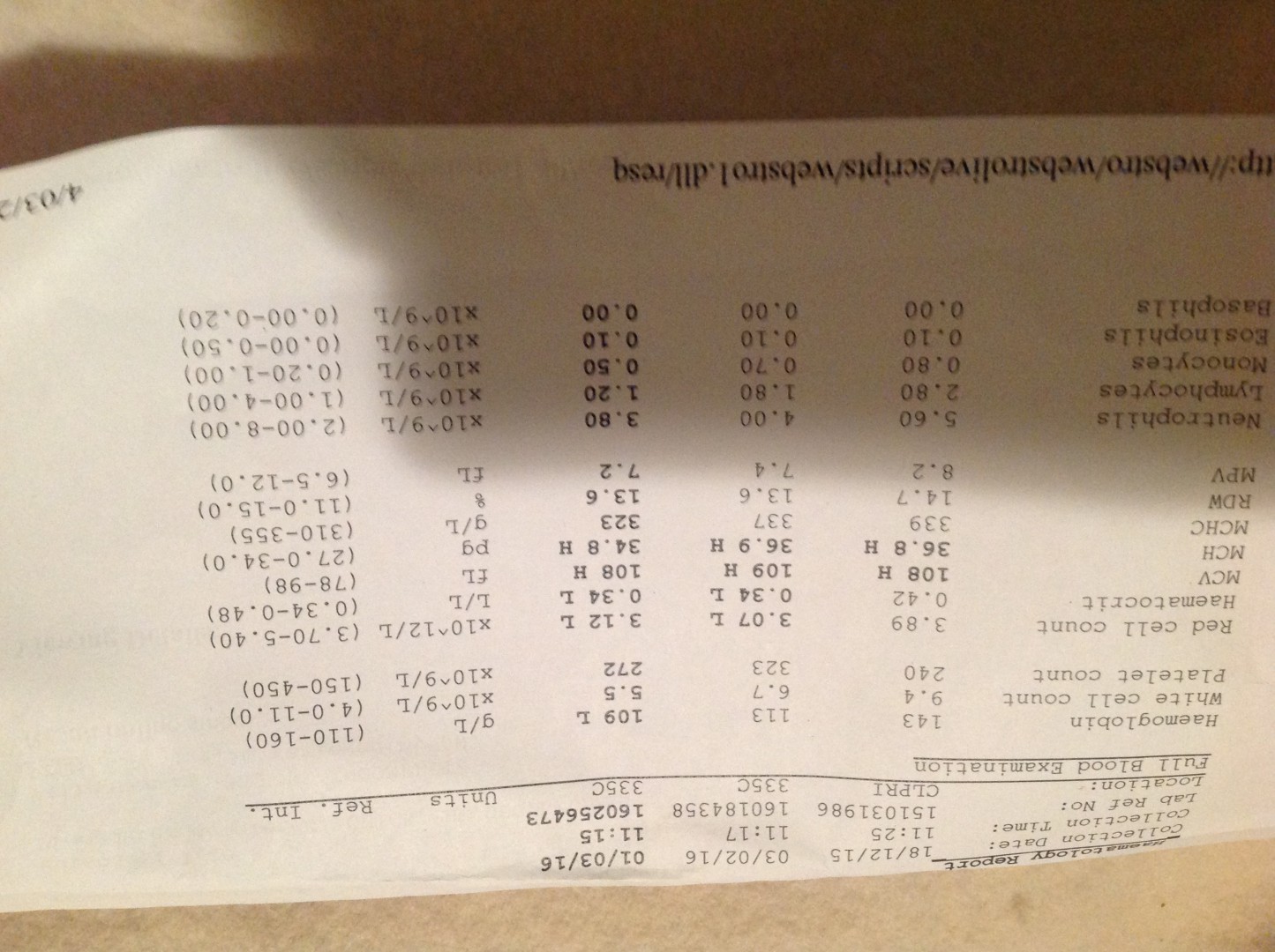 Hi everyone. Just posting up the bloods I had done on 3/01/16 and the catscan(?) I had done last November justweeksbefore treatment. I have neverreally understood what it said.