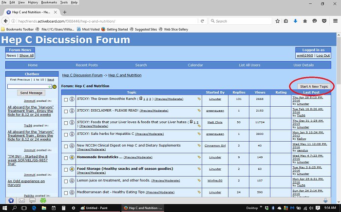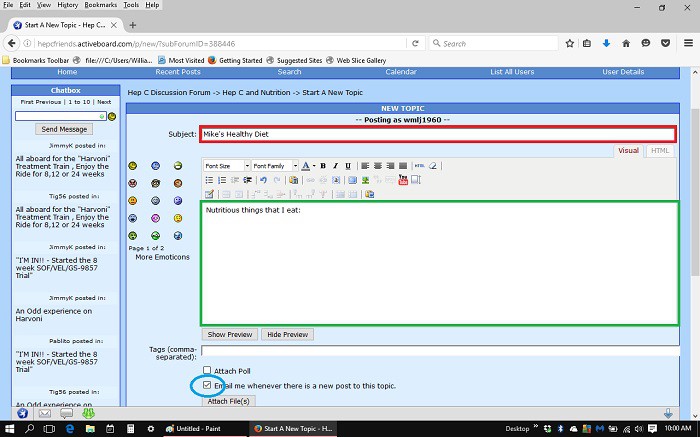 This is an example of how I would start a new thread in the 'Hep C and Nutrition' section of the forum. You can choose which section to start your thread in based on the subject that it pertains to: