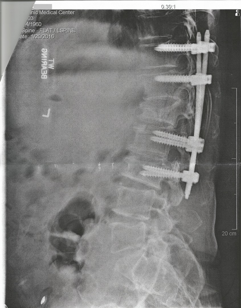 Wow Mike, That really looks BAD! And you say that doesn't hurt? Your one though guy!! I hope you can get some relief on the compression in your spine. That's a lot of hardware in that there X-RAY. You must be on the NO FLY LIST- Your not getting through TSA at the air-port with that! RC