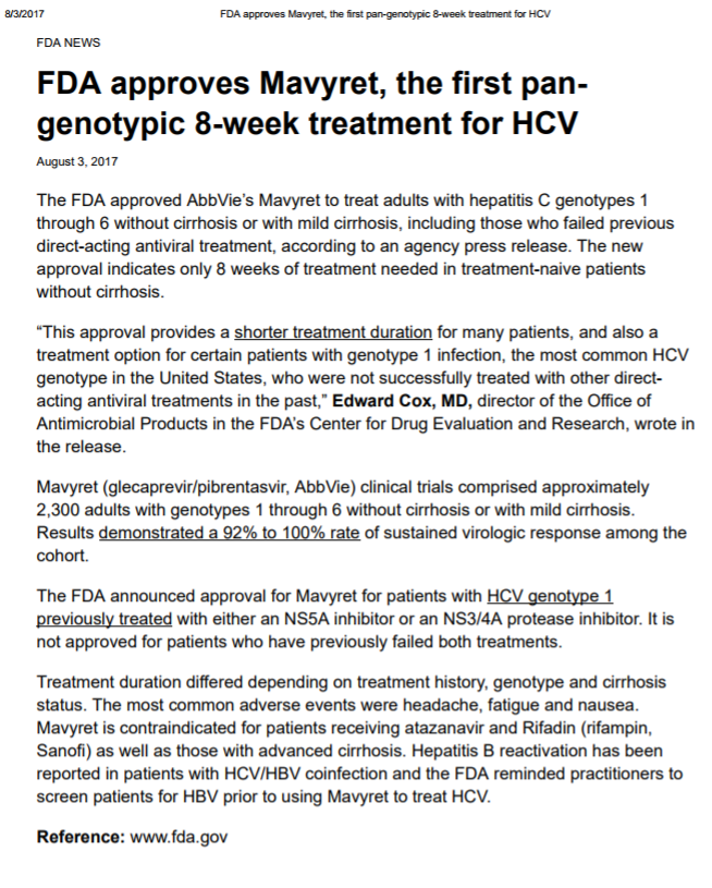 The FDA approved AbbVie’s Mavyret to treat adults with hepatitis C genotypes 1 through 6 without cirrhosis or with mild cirrhosis, including those who failed previous direct-acting antiviral treatment, according to an agency press release. The new approval indicates only 8 weeks of treatment needed in treatment-naive patients without cirrhosis.
