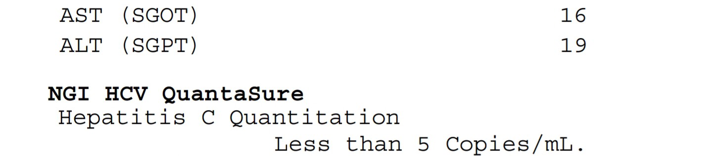BTW - I'm not sure if we ever found out whether they gave you a "fibroscan" and an "abdominal ultrasound" before you started your Mav, or not? Just curious. Nice drop we can see in your ALT and AST too!